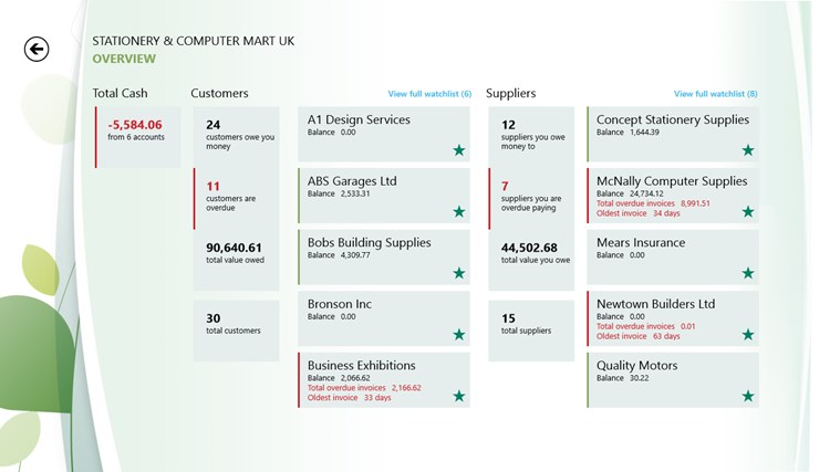 - Transform data into knowledge with easy to understand views of your business finances, customers and suppliers.